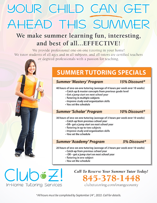 So while summer tutoring may not be at the top of your family’s bucket list this summer, we encourage you to consider the long-term benefits for your child. At ClubZ! In-Home Tutoring we work with students in Pre K to adult in Math Reading, Writing, Test Prep and study skills. We individualize each student’s program to meet specific needs, and we create fun activities and games to motivate each student along the way. Come check us out!